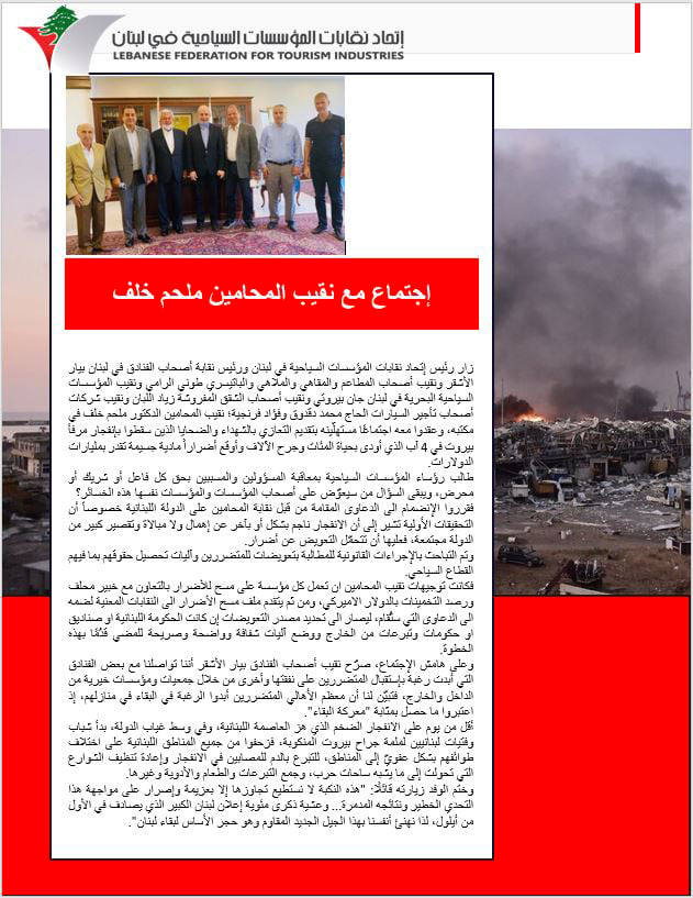 زار رئيس إتحاد نقابات المؤسسات السياحية في لبنان ورئيس نقابة أصحاب الفنادق في لبنان بيار الأشقر ونقيب أصحاب المطاعم والمقاهي والملاهي والباتيسري طوني الرامي ونقيب المؤسسات السياحية البحرية في لبنان جان بيروتي ونقيب أصحاب الشقق المفروشة زياد اللبان ونقيب شركات أصحاب تأجير السيارات الحاج محمد دقدوق وفؤاد فرنجية؛ نقيب المحامين الدكتور ملحم خلف في مكتبه، وعقدوا معه اجتماعًا مستهلّينه بتقديم التعازي بالشهداء والضحايا الذين سقطوا بإنفجار مرفأ بيروت في 4 آب الذي أودى بحياة المئات وجرح الآلاف وأوقع أضراراً مادية جسيمة تقدر بمليارات الدولارات.