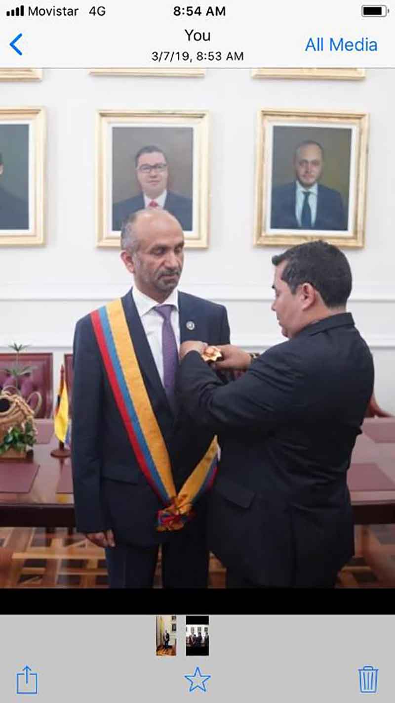 قلد رئيس البرلمان الكولومبي كارلوس تشاكون، رئيس المجلس العالمي للتسامح والسلام أحمد بن محمد الجروان، وسام سيمون بوليفار - محرر أمريكا الجنوبية، وهو الوسام الأعلى في كولومبيا، تقديرا لجهوده في نشر التسامح والسلام حول العالم.