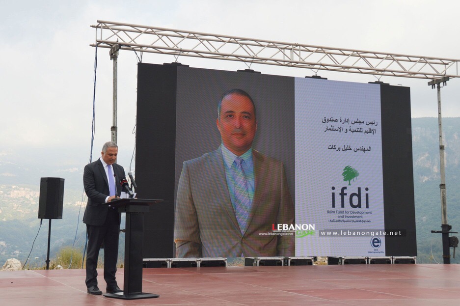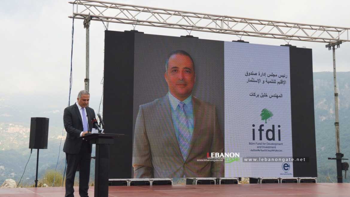 افتتح الحفل بالنشيد الوطني، وتقديم من المحامي باسم حمد، ثم القى رئيس مجلس إدارة صندوق الإقليم للتنمية والاستثمار خليل بركات فأكد ان هذا المشروع يمثّل شراكة تنموية استثمارية مبدعة ومربحة لجميع الأطراف المشاركة في عملية التنمية الاقتصادية المناطقية من خلال المجتمع المحلي المتمثل بأهل المنطقة، والمشاركين في المشروع، والمنظمات العربية والدولية ذات الصلة بالتنمية الاقتصادية، والهيئات الاقتصادية اللبنانية واتحاد الغرف العربية، وجامعات ومعاهد البحوث، والمغتربين والعاملين اللبنانيين في الخارج.