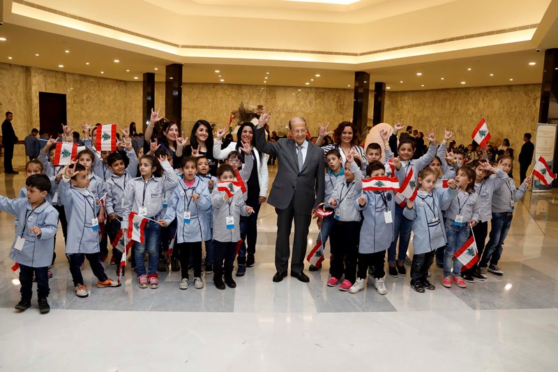 وعند الثانية عشرة والنصف، ولدى انتقال الطلاب الى البهو الداخلي للقصر، قطع رئيس الجمهورية العماد ميشال عون اجتماعاته للقائهم والترحيب بهم، حيث تم التقاط الصور التذكارية.