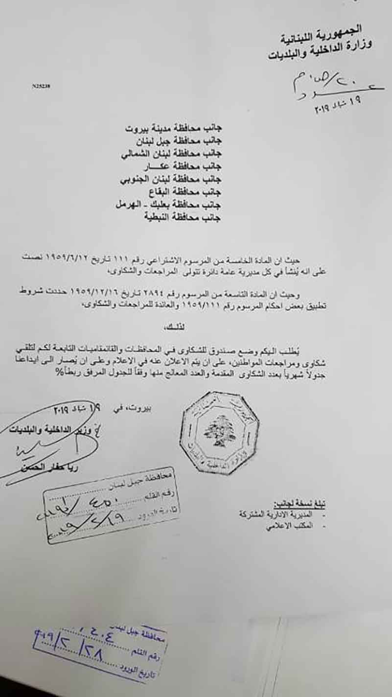 عمم محافظ جبل لبنان القاضي محمد المكاوي على القائمقامين إنفاذا لقرار وزيرة الداخلية ريا الحسن، وضع صندوق للشكاوى في المحافظات والقائمقاميات، لتلقي شكاوى ومراجعات المواطنين، على ان يتم الاعلان عنه في الإعلام ، وان يصار إلى إيداع وزارة الداخلية جدولا شهريا بعدد الشكاوى المقدمة والعدد المعالج منها وفقا لجدول معد لهذا الامر.
