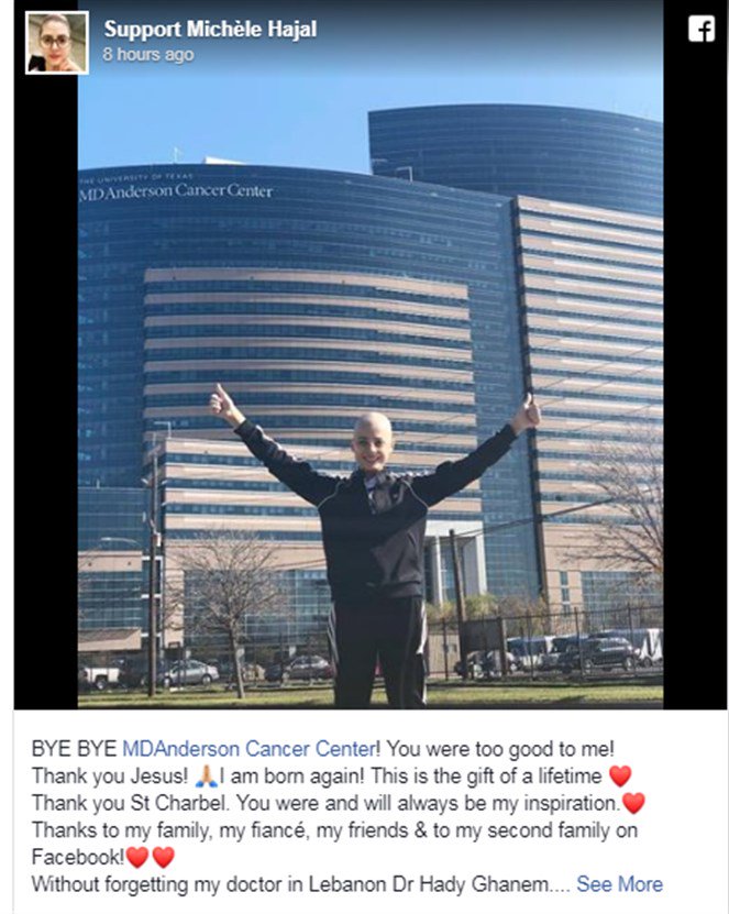 وعلّقت على الصورة بالقول: "إلى اللقاء Anderson Cancer Center! لقد كنت جيّد جدًا بالنسبة لي. شكرًا يسوع... لقد ولدت من جديد! هذه هدية العمر. شكرًا مار شربل، كنت وستبقى دائمًا مصدر إلهامي. شكرًا لعائلتي، لخطيبي، لأصدقائي ولعائلتي الثانية على فيسبوك، من دون أن أنسى طبيبي في لبنان د. هادي غانم".