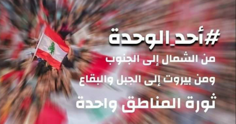 “بعد المحاولات الكثيرة لقوى المنظومة لضرب الإنتفاضة والإلتفاف على ثورة الشارع، تحاول أحزاب السلطة استخدام ورقة التفرقة المذهبية والطائفية بهدف حرف ثورتنا عن مسارها عبر أدواتهم المعروفة، وبعد إصرار الناس على مواجهة كلّ قوى المنظومة في كلّ المناطق وفي كلّ الساحات ملتزمين بمطالب الثوار الموحّدة وبسلمية التحركات وبالحرص على تضامن الناس رغم كلّ الإعتداءات والظلم والقمع الممنهج الواقع بحق الناس، فلنعلن يوم الأحد يوم الوحدة، وحدة حقوقنا ومصالحنا بوجه وحدة قوى المنظومة الحاكمة التي تنتهك حقوق الناس. في أحد الوحدة، فنملأ الساحات العامة والشوارع وننزل في تظاهرات حاشدة في كل المناطق حتى تحقيق باقي أهداف الثورة: استشارات نيابية فورية من أجل تشكيل حكومة موقتة ذات مهام محدّدة، حكومة للناس من خارج مكونات الطبقة الحاكمة تتحدد مهامها بما يلي: 1- إدارة الأزمة المالية وتخفيف عبء الدين العام وإقرار قانون يحقق العدالة الضريبية. 2- إنتخابات نيابية مبكرة تنتج سلطة تمثل الشعب. 3- القيام بحملة جدّية لمناهضة الفساد ضمنها إقرار قوانين استقلالية القضاء واستعادة الأموال العامة المنهوبة”.