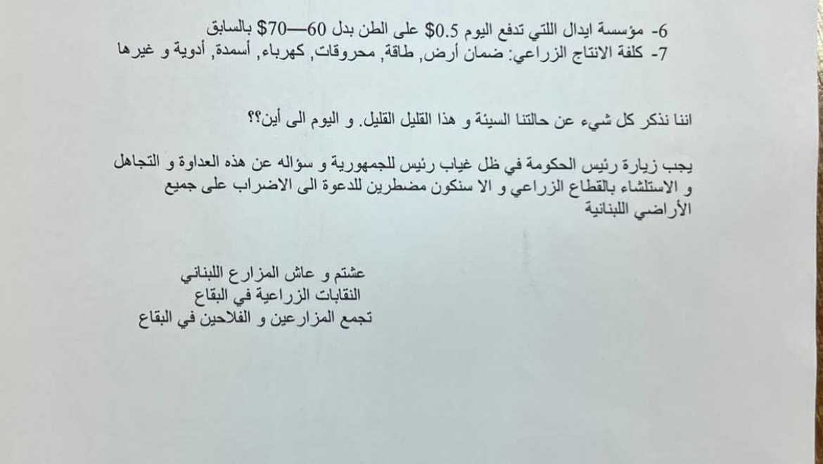 يجب زيارة رئيس الحكومة في ظل غياب رئيس للجمهورية و سؤاله عن هذه العداوة و التجاهل و الاستلشاء بالقطاع الزراعي و الا سنكون مضطرين للدعوة الى الاضراب على جميع الأراضي اللبنانية