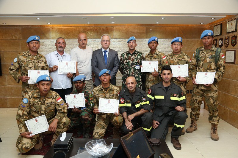 سلم المدير العام للدفاع المدني العميد ريمون خطار شهادات لعناصر من قوة الأمم المتحدة المؤقتة في لبنان، في ختام دورة تدريبية نظمتها المديرية العامة للدفاع المدني، بهدف بناء قدراتهم في مجالي الإنقاذ البحري والإسعافات الأولية.