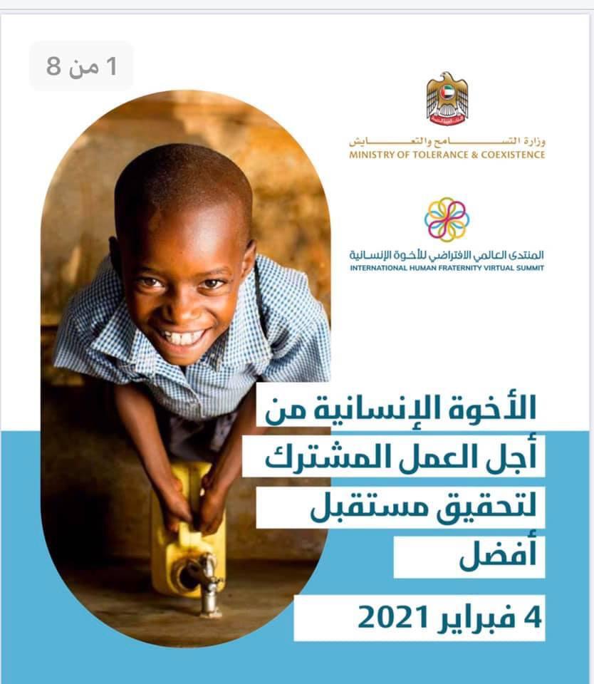 وزارة التسامح والتعايش بدولة الإمارات العربية المتحدة لحضور فعاليات النسخة الافتراضية الأولى "المنتدى العالمي للأخوة الانسانية"، وذلك تحت رعاية ومشاركة معالي الشيخ نهيان بن مبارك آل نهيان – وزير التسامح والتعايش ، المقرر انعقادها في 4 من فبراير 2021 عبر منصة رقمية مبتكرة، تحت شعار" الأخوه الإنسانية أجل العمل المشترك لتحقيق والذي ينعقد يومي الأربعاء والخميس الموافقين 3 و 4 فبراير/شباط 2021م عبر تقنية الفيديو كونفرنس. يوم العالمي للأخوة الإنسانية" الذي اعتمدته الجمعية العمومية للأمم المتحدة بمناسبة توقيع وثيقة الأخوة الإنسانية في أبوظبي بتاريخ 4 فبراير2019، بين فضيلة الإمام الأكبر الدكتور أحمد الطيب شيخ الأزهر الشريف، وقداسة البابا فرنسيس بابا الكنيسة الكاثوليكية وهذه الوثيقة تعتبر واحدة من أهم الوثائق الجامعة للإنسانية .