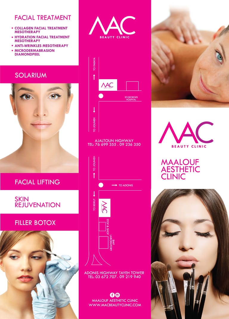 اليوم قصدنا مركز Mac beauty clinic للتجميل وهو من المراكز الموثوقة ويقع في محلة ذوق مصبح الطريق العام حيث كان لنا حديث مع صاحب المركز دكتور زياد معلوف الذي بدوره عرض ما يقدّمه المركز من خدمات تجميليّة مضمونة نظراً للجودة العالية الذي يتمتع بها أضافة الى أطباء مختصّين يتمتعون بكفاءات عالية، ونصح السيدات بعدم الإستهتار وأن تلجأ الى أصحاب الخبرة والإختصاص والجودة العالية حتى لو أختلفت الأسعار.