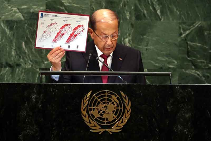 واظهر الرئيس عون الخارطة الصادرة في العام 2014 عن المفوضية السامية للأمم المتحدة لشؤون النازحين، وقد رفعها عاليا خلال القاء كلمته، والتي تبين تطور أعداد النازحين المسجلين من 25 الفا في العام 2012 الى أكثر من مليون في العام 2014، لافتا الى ان "الامم المتحدة توقفت في العام 2014 عن احصاء النازحين، وبعد ذلك التاريخ، تابع الامن العام اللبناني الاحصاءات التي دلت على ان الاعداد تجاوزت منذ ذلك الحين، وحتى اليوم المليون ونصف المليون نازح"، مجددا تأكيد "موقف لبنان الساعي لتثبيت حق العودة الكريمة والآمنة والمستدامة للنازحين الى أرضهم، والرافض كل مماطلة أو مقايضة في هذا الملف الكياني، أو ربطه بحل سياسي غير معلوم متى سيأتي، والرافض قطعا لأي مشروع توطين، سواء لنازح أو للاجئ"، مرحبا بأي مبادرة تسعى لحل مسألة النزوح على غرار المبادرة الروسية.