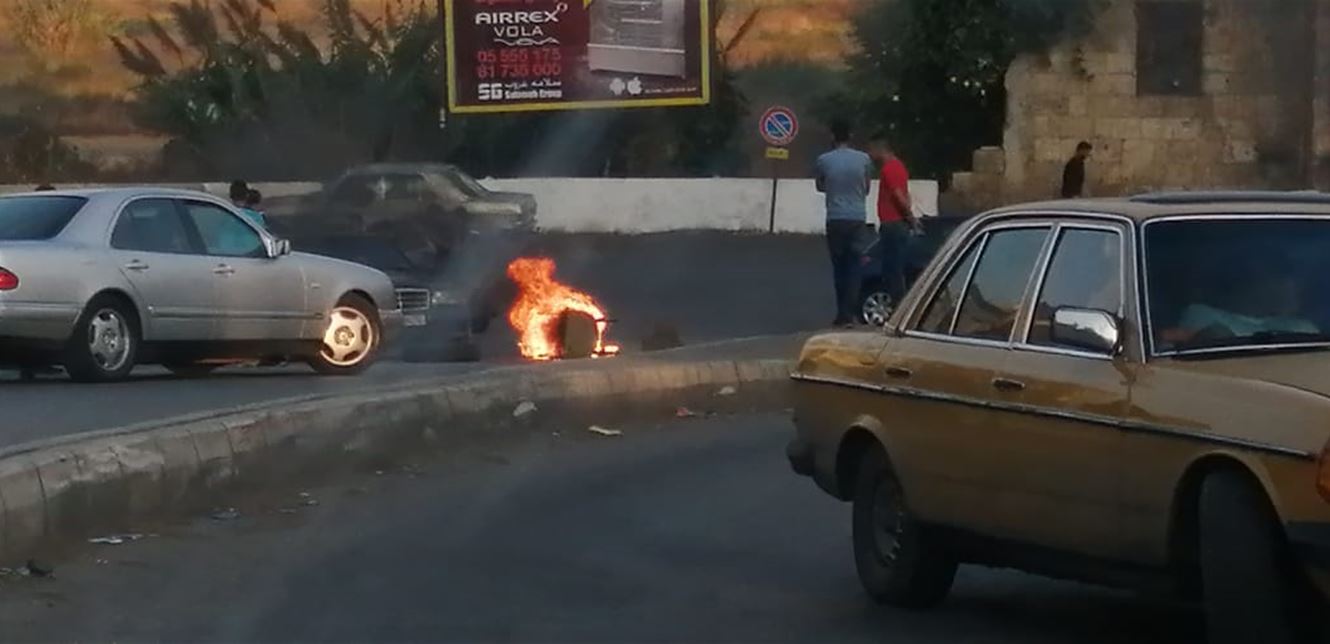 - طريق ضهر العين بالإطارات المشتعلة.