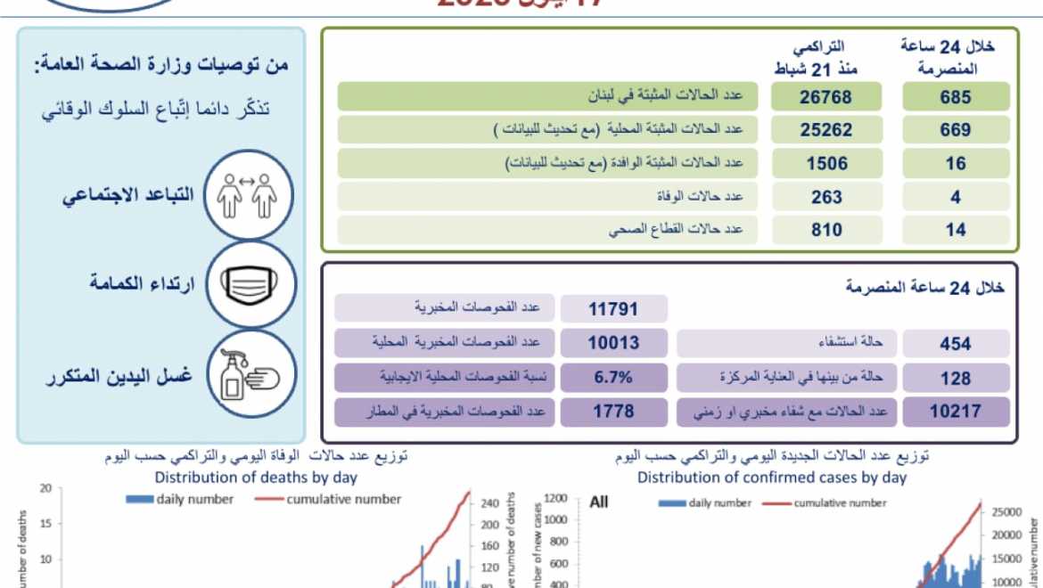 أعلنت وزارة الصحة العامة تسجيل 685 اصابة كورونا جديدة رفعت العدد التراكمي منذ 21 شباط الماضي الى 26768 حالة. وجاء في تقريرها: