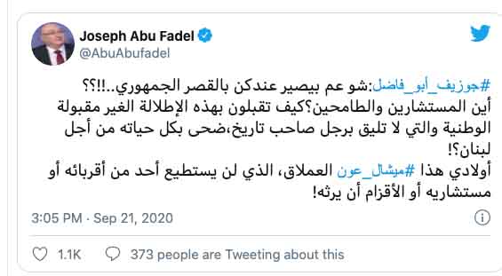 قال الكاتب والمحلل السياسي المحامي جوزيف أبو فاضل، في تغريدة على "تويتر"، "شو عم بيصير عندكن بالقصر الجمهوري..!!؟؟