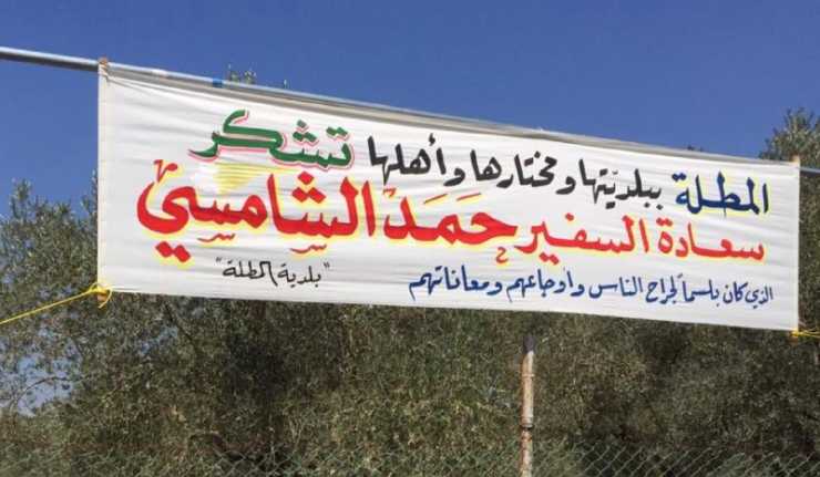 يافطات الشكر والإمتنان خير دليل على وفاء هذه البلدة وأهلها فهكذا استقبلت بلدة المطلة الشوفية السفير الشامسي فزرعت مدخل البلدة من جهة بلدة غريفة يافطات الترحيب "والأهلا وسهلا" معبرة بهذا عن حبها وامتنانها لدولة الإمارات الشقيقة وشعبها وناسها جراء تنفيذ مشروع تعبيد طريق المطلة حصروت بتمويل خاص من مؤسسة خليفة بن زايد آل نهيان للأعمال الإنسانية وتحت رعاية دولة رئيس مجلس الوزراء السيد سعد الحريري ومشاركة شخصيات وفعاليات المنطقة.